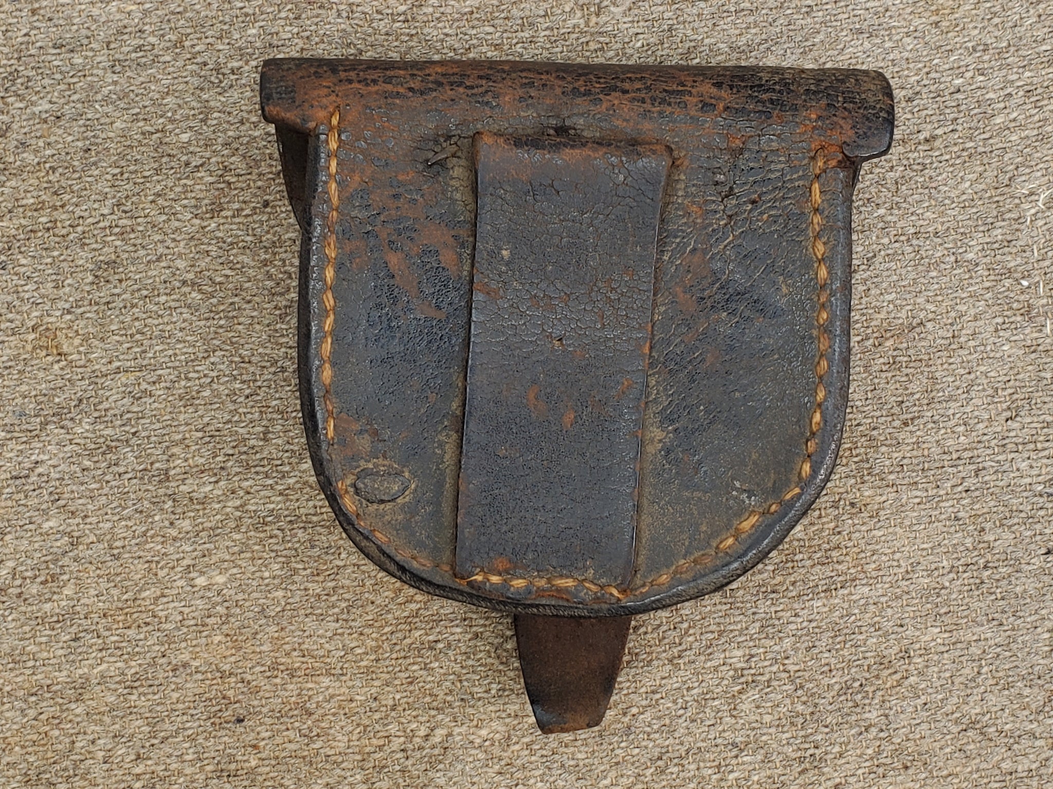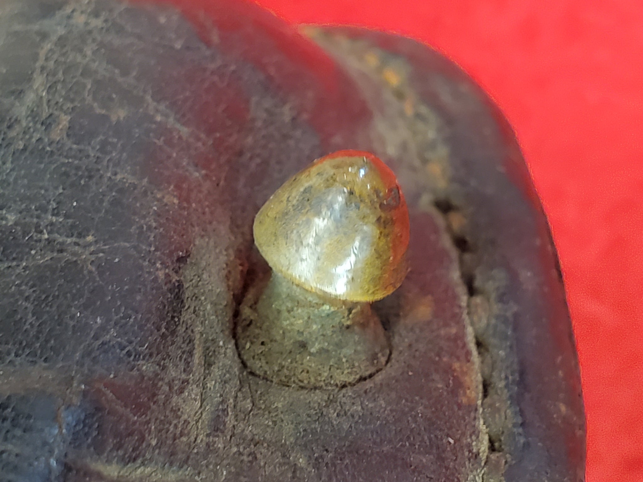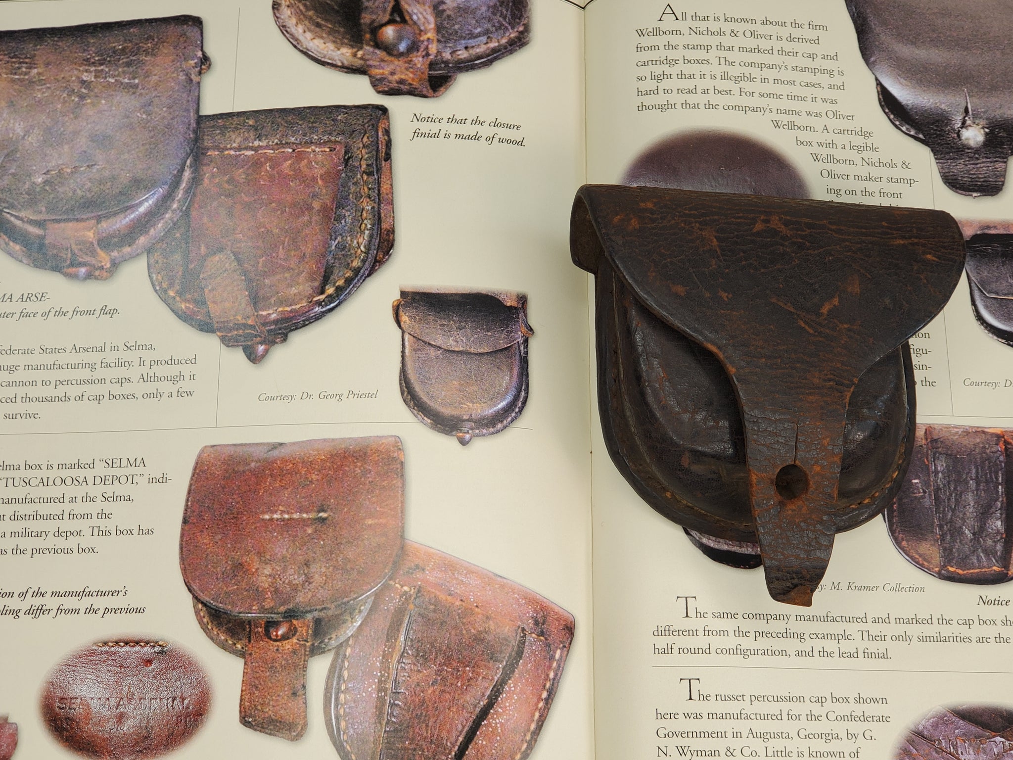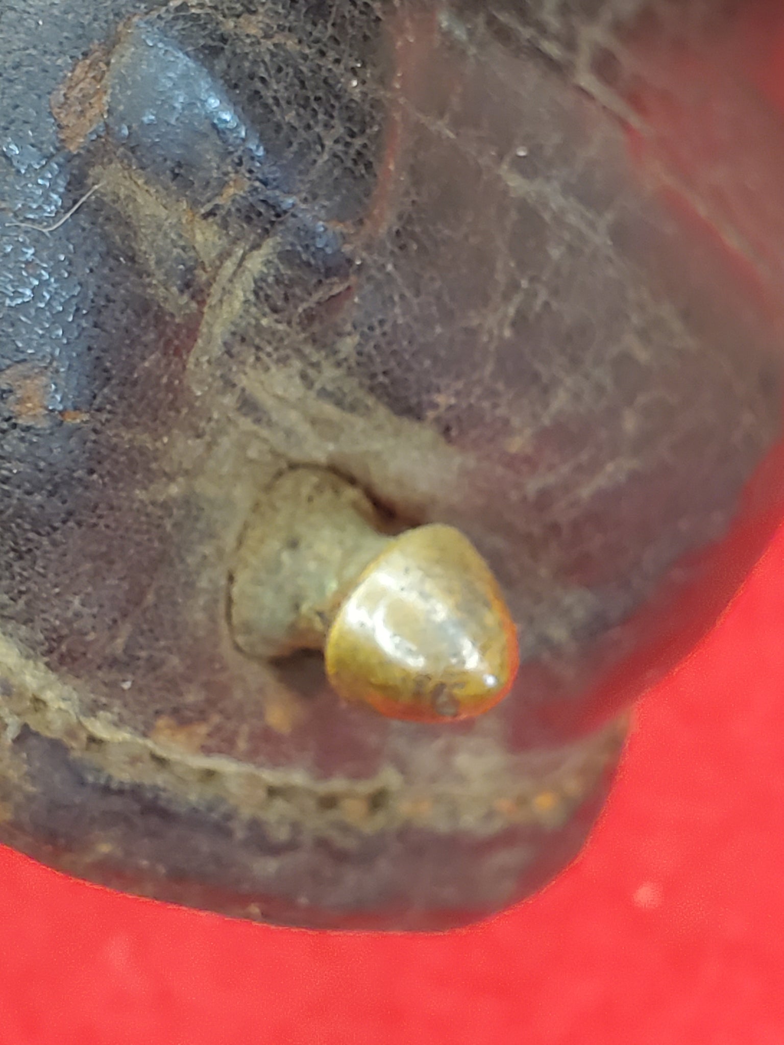 Original Civil War Confederate Percussion Cap Box in perfect condition. Has the single belt loop on the reverse. Beautiful patina on the brass finial. closure tab is intact and complete. Beautiful example. Please see all photos for condition.