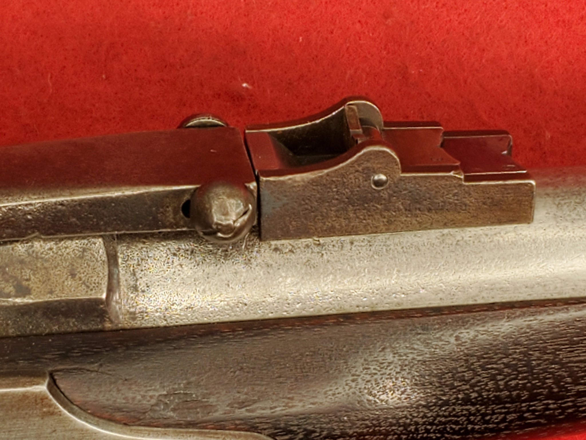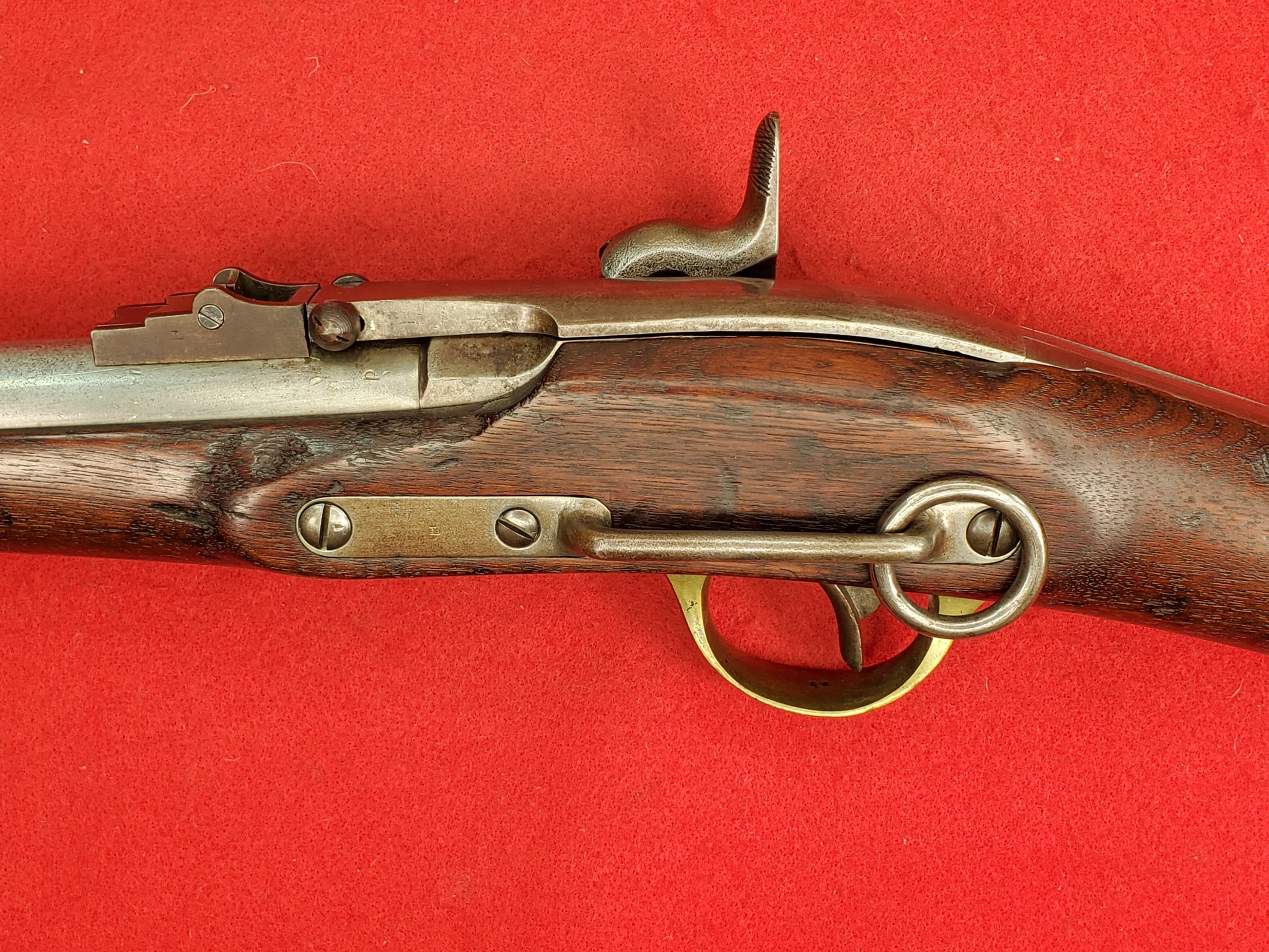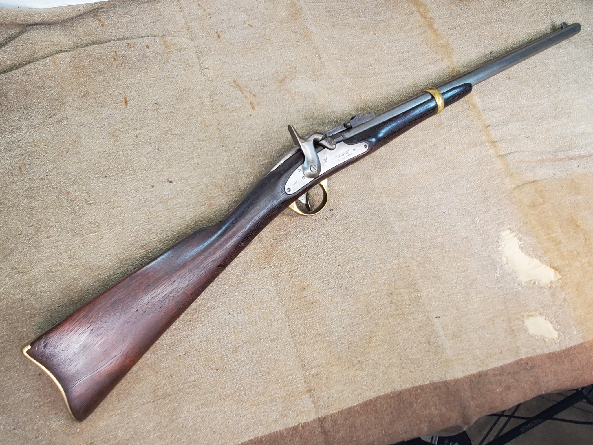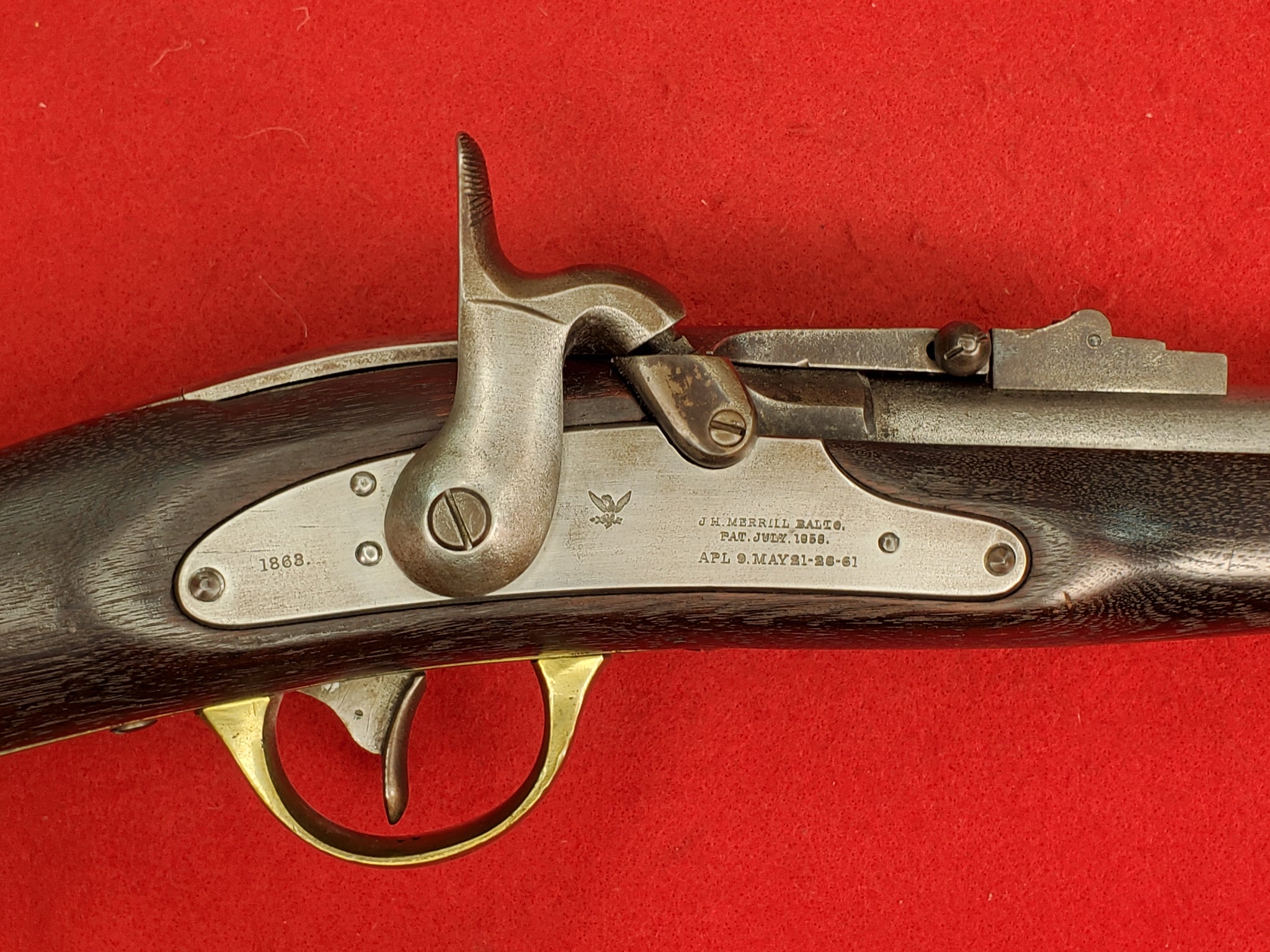 Original Civil War Merrill 2nd Model Breechloading Percussion Carbine with 1863 date. The lock is in beautiful mint condition. Has a great maker mark / patent date in front of the hammer and 1863 date on the rear of the lock. The mechanics are fully functional in great working condition. The stock is in great shape with a really nice inspection cartouche. Has a beautiful patina on its brass U.S. marked buttplate barrel band and trigger guard. Barrel is full length with the original rear leaf sight and long range pinch sight intact. Great rifling in the barrel. A very nice example that will make a great addition to any collection.