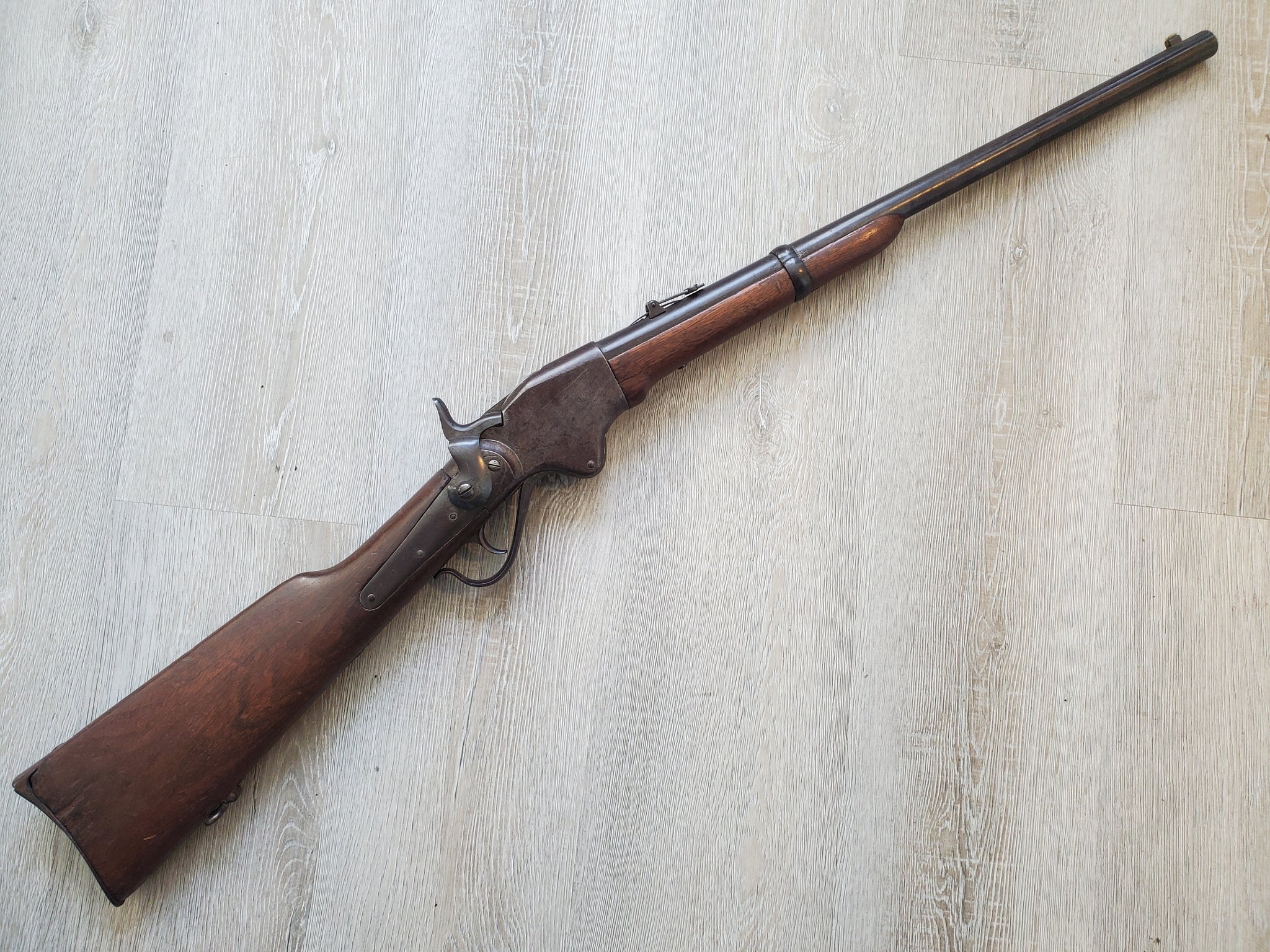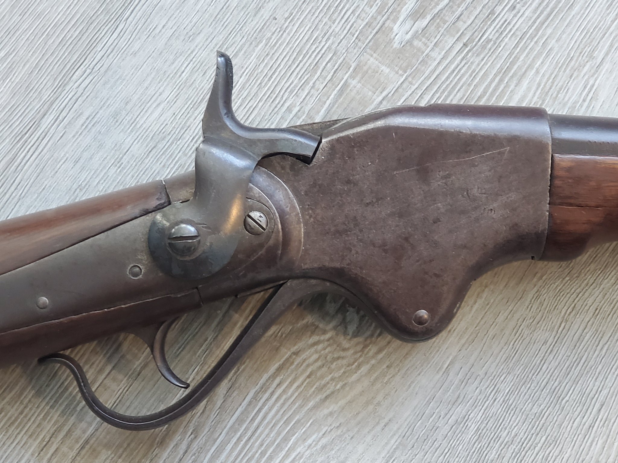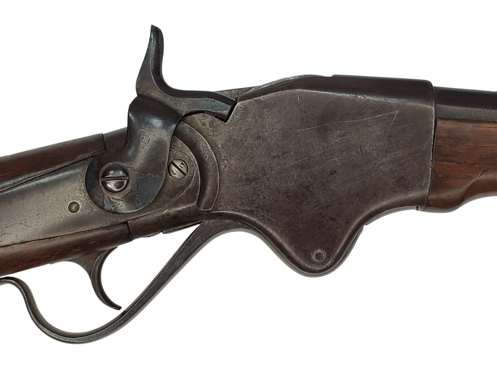 Original Civil War Spencer M1860 Cavalry Carbine with beautiful displaying patina. This was a 7-shot weapon that fired metallic cartridges loaded from the bottom of the buttplate. Has the Spencer Maker/Patent Date as well as SN#41839. The mechanics are fully functional with nice action. The walnut stock is in good shape with one small crack as shown in pics and some wear around the buttplate. Has the long range rear sight as well as the front pinch sight. Barrel is full length with rifling remaining. Overall great addition to any Civil War Cavalry display or other museum collection. Please see all photos.